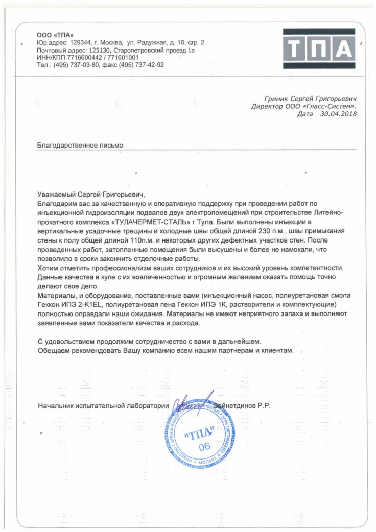 Многофункциональный комплекс "Лахта центр" успешно сотрудничает с ООО «Гласс Систем» по инъекционной и обмазочной гидроизоляции подземных сооружений, устройству промышленных полиуретановых полов, устройству бесшовной наливной полиуретановой кровли. Работы выполнялись с использованием материалов линейки «ГЕККОН». Предложенные технологии и используемые материалы показали себя эффективными и надежными.